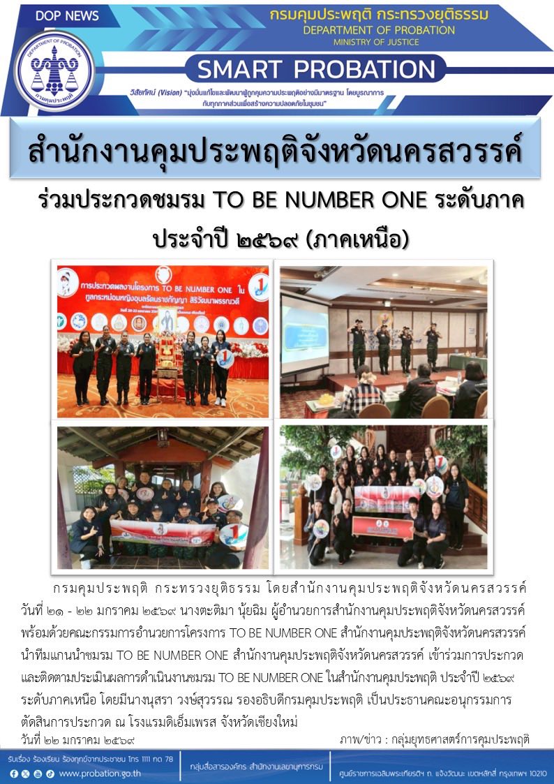 นางตะติมา นุ้ยฉิม ผู้อำนวยการสำนักงานคุมประพฤติจังหวัดนครสวรรค์ พร้อมด้วยคณะกรรมการอำนวยการโครงการ TO BE NUMBER ONE สำนักงานคุมประพฤติจังหวัดนครสวรรค์ นำทีมแกนนำชมรม TO BE NUMBER ONE สำนักงานคุมประพฤติจังหวัดนครสวรรค์ เข้าร่วมการประกวดและการติดตามประเมินผลการดำเนินงานชมรม TO BE NUMBER ONE ในสำนักงานคุมประพฤติ ประจำปี พ.ศ. 2569 ระดับภาคเหนือ โดยมีนางนุสรา วงษ์สุวรรณ รองอธิบดีกรมคุมประพฤติ เป็นประธานคณะอนุกรรมการตัดสินการประกวด ณ โรงแรมดิเอ็มเพรส จังหวัดเชียงใหม่