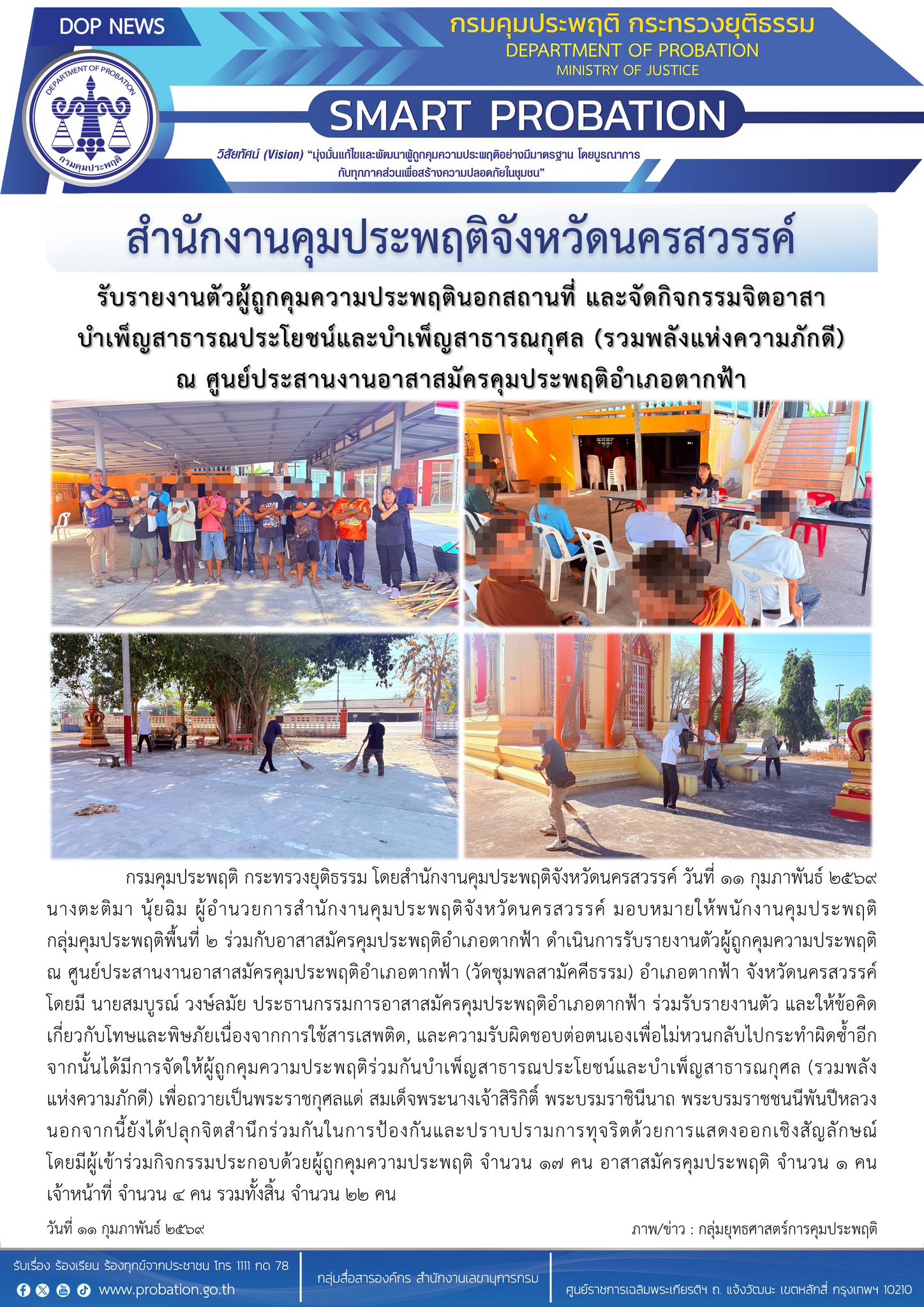พนักงานคุมประพฤติ กลุ่มคุมประพฤติพื้นที่ 2 ร่วมกับอาสาสมัครคุมประพฤติอำเภอตากฟ้า ดำเนินการรับรายงานตัวผู้ถูกคุมความประพฤติ ณ ศูนย์ประสานงานอาสาสมัครคุมประพฤติอำเภอตากฟ้า (วัดชุมพลสามัคคีธรรม) อำเภอตากฟ้า จังหวัดนครสวรรค์ จากนั้นได้มีการจัดให้ผู้ถูกคุมความประพฤติร่วมกันบำเพ็ญสาธารณประโยชน์และบำเพ็ญสาธารณกุศล (รวมพลังแห่งความภักดี) เพื่อถวายเป็นพระราชกุศลแด่ สมเด็จพระนางเจ้าสิริกิติ์ พระบรมราชินีนาถ พระบรมราชชนนีพันปีหลวง