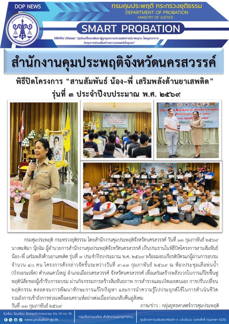 นางตะติมา นุ้ยฉิม ผู้อำนวยการสำนักงานคุมประพฤติจังหวัดนครสวรรค์ เป็นประธานในพิธีปิดโครงการสานสัมพันธ์ น้อง–พี่ เสริมพลังต้านยาเสพติด รุ่นที่ 3 ประจำปีงบประมาณ พ.ศ. 2569 พร้อมมอบเกียรติบัตรแก่ผู้ผ่านการอบรม จำนวน 40 คน โครงการดังกล่าวจัดขึ้นระหว่างวันที่ 9-13 กุมภาพันธ์ 2569 ณ ห้องประชุมเสือพ่นน้ำ (บึงบอระเพ็ด) ตำบลแควใหญ่ อำเภอเมืองนครสวรรค์ จังหวัดนครสวรรค์ เพื่อเสริมสร้างพลังบวกในการแก้ไขฟื้นฟูพฤตินิสัยของผู้เข้ารับการอบรม