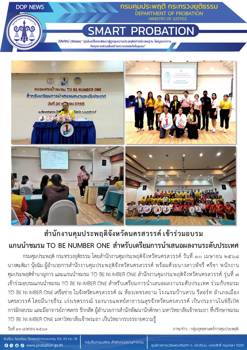 สำนักงานคุมประพฤติจังหวัดนครสวรรค์ เข้าร่วมอบรมแกนนำชมรม TO BE NUMBER ONE สำหรับเตรียมการนำเสนอผลงานระดับประเทศ