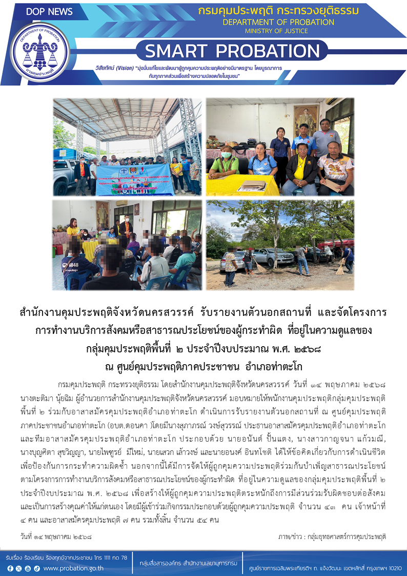 สำนักงานคุมประพฤติจังหวัดนครสวรรค์ รับรายงานตัวนอกสถานที่ และจัดโครงการการทำงานบริการสังคมหรือสาธารณประโยชน์ของผู้กระทำผิด ที่อยู่ในความดูแลของ กลุ่มคุมประพฤติพื้นที่ 2 ปรำจะปีงบประมาณ พ.ศ. 2568 ณ ศูนย์คุมประพฤติภาคประชาชน อำเภอท่าตะโก