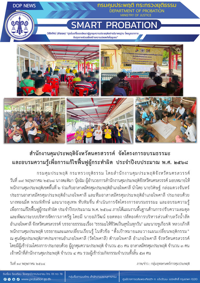 สำนักงานคุมประพฤติจังหวัดนครสวรรค์ จัดโครงการอบรบธรรมะ และอบรมความรู้เพื่อการแก้ไขฟื้นฟูผู้กระทำผิด ประจำปีงบประมาณ พ.ศ. 2568