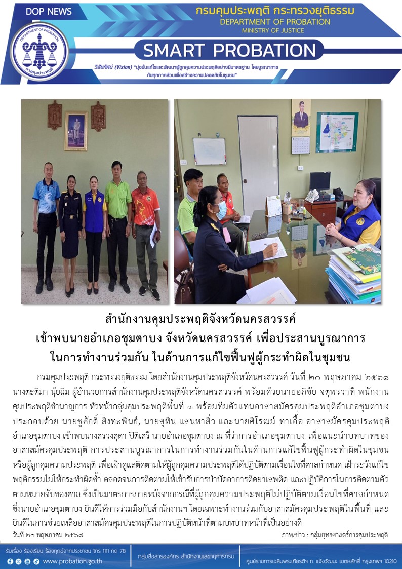 สำนักงานคุมประพฤติจังหวัดนครสวรรค์ เข้าพบนายอำเภอชุมตาบง จังหวัดนครสวรรค์ เพื่อประสานบูรณาการในการทำงานร่วมกัน ในด้านการแก้ไขฟื้นฟูผู้กระทำผิดในชุมชน