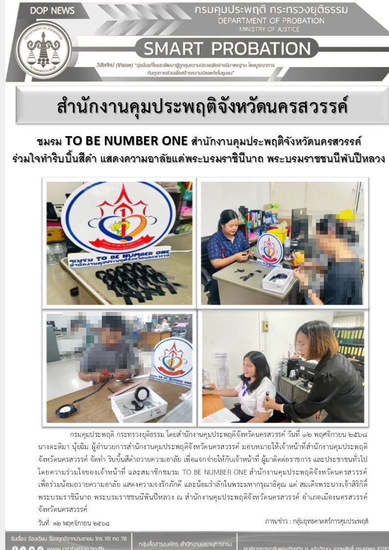 วันที่ 12 พฤศจิกายน 2568 นางตะติมา นุ้ยฉิม ผู้อำนวยการสำนักงานคุมประพฤติจังหวัดนครสวรรค์ มอบหมายให้เจ้าหน้าที่สำนักงานคุมประพฤติจังหวัดนครสวรรค์ ร่วมกับสมาชิกชมรม TO BE NUMBER ONE สำนักงานคุมประพฤติจังหวัดนครสวรรค์ จัดทำริบบิ้นสีดำถวายความอาลัย เพื่อแจกจ่ายให้กับเจ้าหน้าที่ ผู้มาติดต่อราชการ และประชาชนทั่วไป โดยความร่วมใจของเจ้าหน้าที่ และสมาชิกชมรม TO BE NUMBER ONE สำนักงานคุมประพฤติจังหวัดนครสวรรค์ เพื่อร่วมน้อมถวายความอาลัย แสดงความจงรักภักดี และน้อมรำลึกในพระมหากรุณาธิคุณ แด่ สมเด็จพระนางเจ้