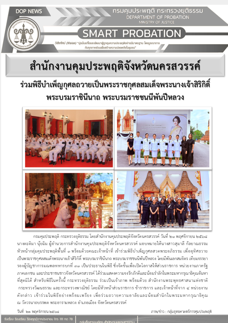 หัวหน้ากลุ่มคุมประพฤติพื้นที่ 1 พร้อมด้วยคณะเจ้าหน้าที่ เข้าร่วมพิธีบำเพ็ญกุศลสวดพระอภิธรรม เพื่ออุทิศถวาย เป็นพระราชกุศลสมเด็จพระนางเจ้าสิริกิติ์ พระบรมราชินีนาถ พระบรมราชชนนีพันปีหลวง โดยมีพันเอกสมจิตร เทียมจรรยา รองผู้บัญชาการมณฑลทหารบกที่ ๓๑ เป็นประธานในพิธี ซึ่งจัดขึ้นเพื่อเปิดโอกาสให้ส่วนราชการ หน่วยงานภาครัฐ ภาคเอกชน และประชาชนชาวจังหวัดนครสวรรค์ ได้ร่วมแสดงความจงรักภักดีและน้อมรำลึกในพระมหากรุณาธิคุณอันหาที่สุดมิได้ สำหรับพิธีในครั้งนี้ กระทรวงยุติธรรม ร่วมเป็นเจ้าภาพ พร้อมด้วย สำนักงานพระพุทธศาสนาแห่งชาติ