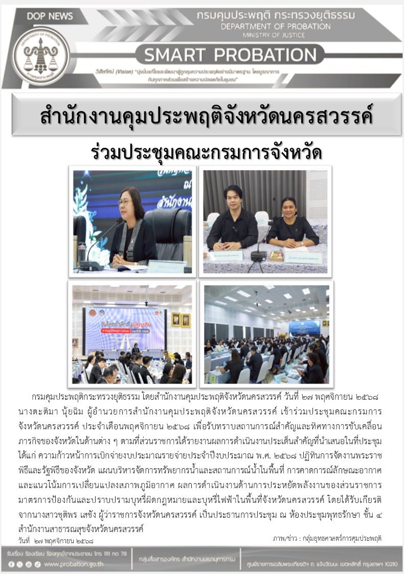 วันที่ 27 พฤศจิกายน 2568 นางตะติมา นุ้ยฉิม ผู้อำนวยการสำนักงานคุมประพฤติจังหวัดนครสวรรค์ เข้าร่วมประชุมคณะกรมการจังหวัดนครสวรรค์ ประจำเดือนพฤศจิกายน 2568 เพื่อรับทราบสถานการณ์สำคัญและทิศทางการขับเคลื่อนภารกิจของจังหวัดในด้านต่าง ๆ ตามที่ส่วนราชการได้รายงานผลการดำเนินงานประเด็นสำคัญที่นำเสนอในที่ประชุม ได้แก่ ความก้าวหน้าการเบิกจ่ายงบประมาณรายจ่ายประจำปีงบประมาณ พ.ศ. 2568 ปฏิทินการจัดงานพระราชพิธีและรัฐพิธีของจังหวัด แผนบริหารจัดการทรัพยากรน้ำและสถานการณ์น้ำในพื้นที่ การคาดการณ์ลักษณะอากาศและแนวโ