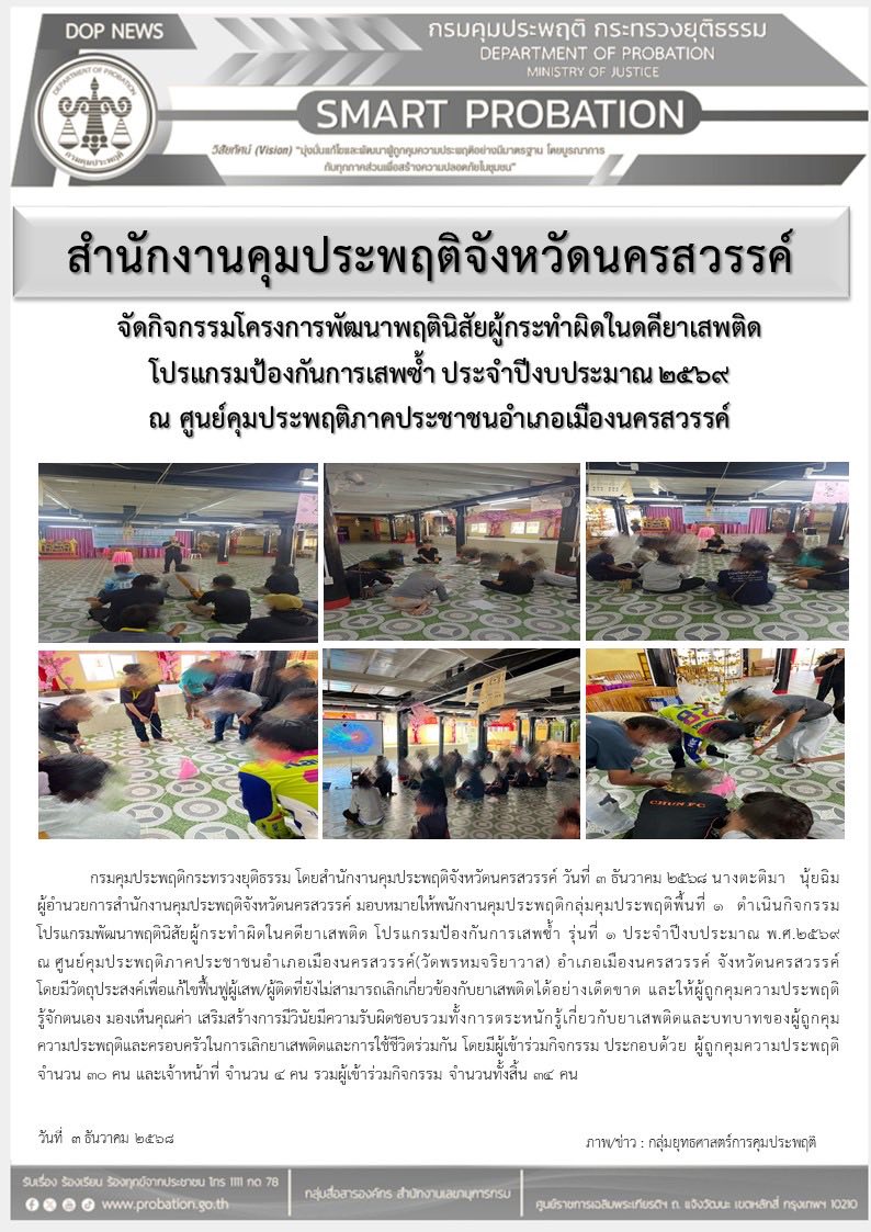วันที่ 3 ธันวาคม 2568 นางตะติมา นุ้ยฉิม ผู้อำนวยการสำนักงานคุมประพฤติจังหวัดนครสวรรค์ มอบหมายให้พนักงานคุมประพฤติกลุ่มคุมประพฤติพื้นที่ 1 ดำเนินกิจกรรมโปรแกรมพัฒนาพฤตินิสัยผู้กระทำผิดในคดียาเสพติด โปรแกรมป้องกันการเสพซ้ำ รุ่นที่ 1 ประจำปีงบประมาณ พ.ศ.2569 ณ ศูนย์คุมประพฤติภาคประชาชนอำเภอเมืองนครสวรรค์(วัดพรหมจริยาวาส) อำเภอเมืองนครสวรรค์ จังหวัดนครสวรรค์ โดยมีวัตถุประสงค์เพื่อแก้ไขฟื้นฟูผู้เสพ/ผู้ติดที่ยังไม่สามารถเลิกเกี่ยวข้องกับยาเสพติดได้อย่างเด็ดขาด และให้ผู้ถูกคุมความประพฤติรู้จักตนเอง