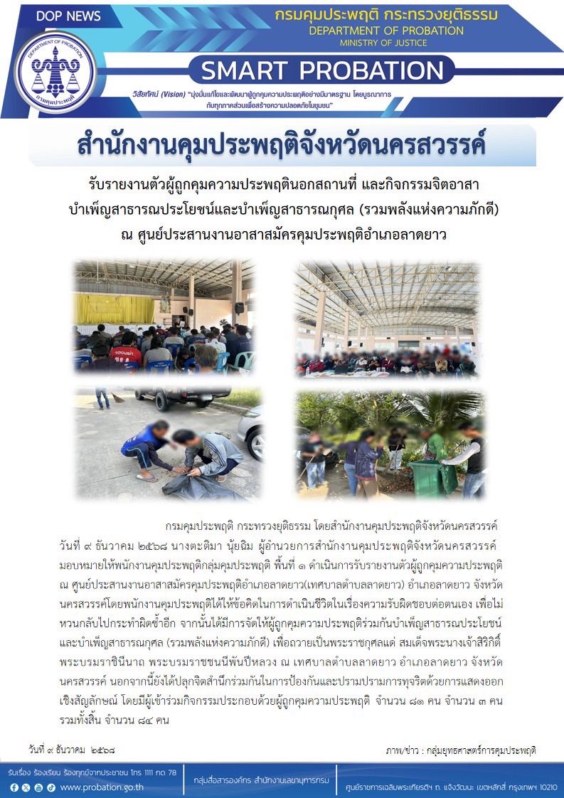 พนักงานคุมประพฤติกลุ่มคุมประพฤติ พื้นที่ 1 ดำเนินการรับรายงานตัวผู้ถูกคุมความประพฤติ ณ ศูนย์ประสานงานอาสาสมัครคุมประพฤติอำเภอลาดยาว(เทศบาลตำบลลาดยาว) อำเภอลาดยาว จังหวัดนครสวรรค์พนักงานคุมประพฤติได้ให้ข้อคิดในการดำเนินชีวิตความรับผิดชอบต่อตนเอง เพื่อไม่หวนกลับไปกระทำผิดซ้ำอีก จากนั้นได้มีการจัดให้ผู้ถูกคุมความประพฤติร่วมกันบำเพ็ญสาธารณประโยชน์ และบำเพ็ญสาธารณกุศล (รวมพลังแห่งความภักดี) ฯ