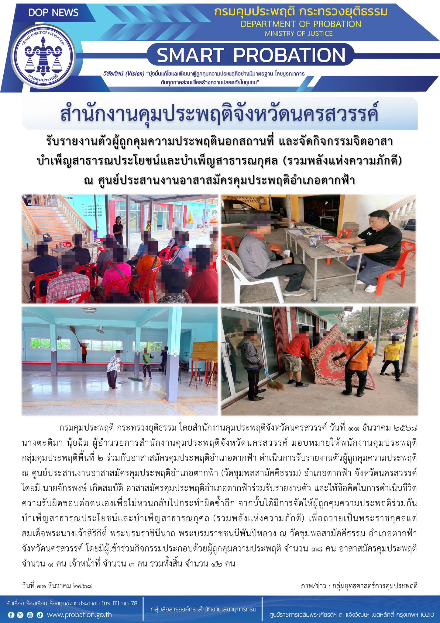 วันที่ 11 ธันวาคม 2568 นางตะติมา นุ้ยฉิม ผู้อำนวยการสำนักงานคุมประพฤติจังหวัดนครสวรรค์ มอบหมายให้พนักงานคุมประพฤติกลุ่มคุมประพฤติพื้นที่ 2 ร่วมกับอาสาสมัครคุมประพฤติอำเภอตากฟ้า ดำเนินการรับรายงานตัวผู้ถูกคุมความประพฤติ ณ ศูนย์ประสานงานอาสาสมัครคุมประพฤติอำเภอตากฟ้า (วัดชุมพลสามัคคีธรรม) อำเภอตากฟ้า จังหวัดนครสวรรค์ โดยมี นายจักรพงษ์ เกิดสมบัติ อาสาสมัครคุมประพฤติอำเภอตากฟ้าร่วมรับรายงานตัว และให้ข้อคิดในการดำเนินชีวิตความรับผิดชอบต่อตนเองเพื่อไม่หวนกลับไปกระทำผิดซ้ำอีก จากนั้นได้มีการจัดให้ผู้ถู