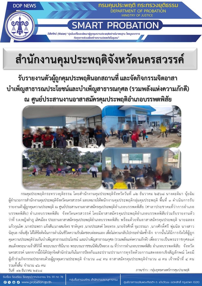 พนักงานคุมประพฤติกลุ่มคุมประพฤติ พื้นที่ 1 ดำเนินการรับรายงานตัวผู้ถูกคุมความประพฤติ ณ ศูนย์ประสานงานอาสาสมัครคุมประพฤติอำเภอบรรพตพิสัย (ศาลาประชาคมที่ว่าการอำเภอบรรพตพิสัย) อำเภอบรรพตพิสัย โดยมีอาสาสมัครคุมประพฤติอำเภอบรรพตพิสัยร่วมรับรายงานตัว ว่าที่ ร.ต.หญิงลำภู เลิศเมือง ประธานอาสาสมัครคุมประพฤติอำเภอบรรพตพิสัย พร้อมด้วยทีมอาสาสมัครคุมประพฤติจากนั้นได้มีการจัดให้ผู้ถูกคุมความประพฤติร่วมกันบำเพ็ญสาธารณประโยชน์ และบำเพ็ญสาธารณกุศล (รวมพลังแห่งความภักดี) เพื่อถวายเป็นพระราชกุศล