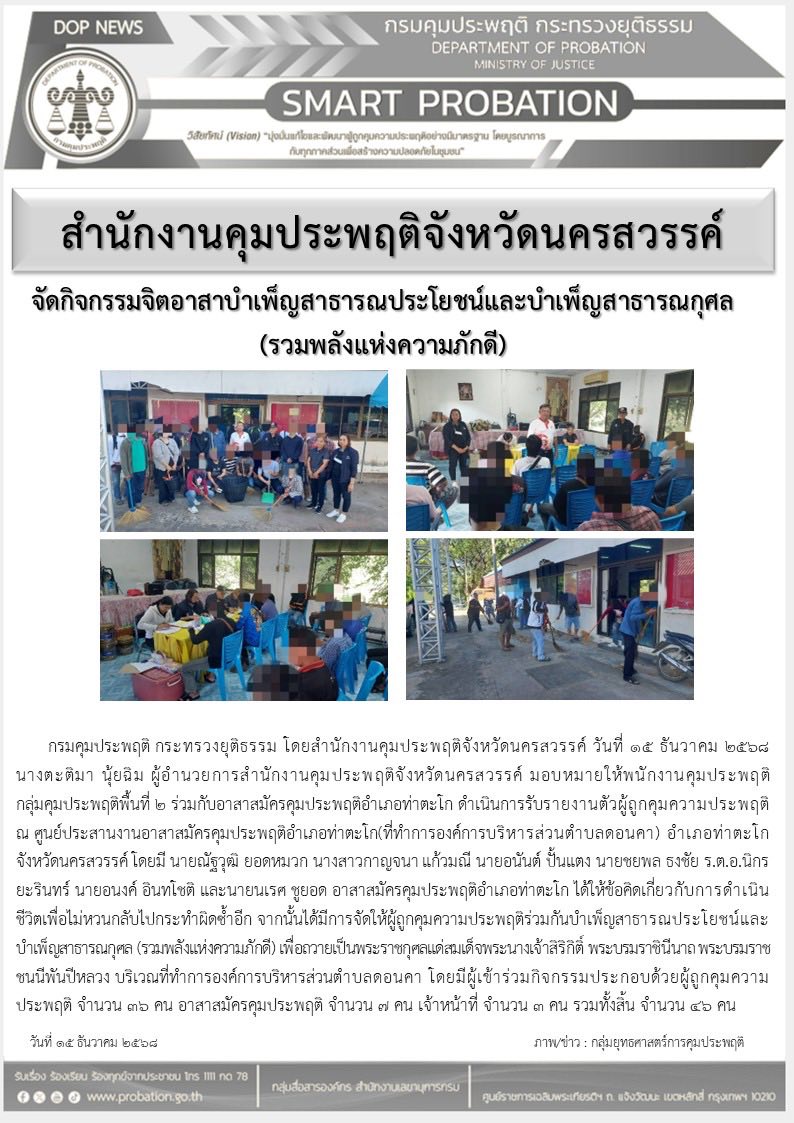 พนักงานคุมประพฤติกลุ่มคุมประพฤติพื้นที่ 2 ร่วมกับอาสาสมัครคุมประพฤติอำเภอท่าตะโก ดำเนินการรับรายงานตัวผู้ถูกคุมความประพฤติ ณ ศูนย์ประสานงานอาสาสมัครคุมประพฤติอำเภอท่าตะโก(ที่ทำการองค์การบริหารส่วนตำบลดอนคา) อำเภอท่าตะโกจังหวัดนครสวรรค์ จากนั้นได้มีการจัดให้ผู้ถูกคุมความประพฤติร่วมกันบำเพ็ญสาธารณประโยชน์และบำเพ็ญสาธารณกุศล (รวมพลังแห่งความภักดี) เพื่อถวายเป็นพระราชกุศลแด่สมเด็จพระนางเจ้าสิริกิติ์ พระบรมราชินีนาถ พระบรมราชชนนีพันปีหลวง บริเวณที่ทำการองค์การบริหารส่วนตำบลดอนคา