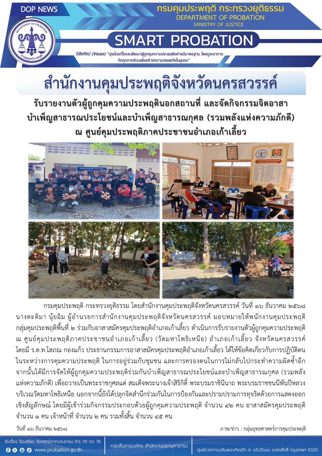 พนักงานคุมประพฤติ กลุ่มคุมประพฤติพื้นที่ 2 ร่วมกับอาสาสมัครคุมประพฤติอำเภอเก้าเลี้ยว ดำเนินการรับรายงานตัวผู้ถูกคุมความประพฤติ ณ ศูนย์คุมประพฤติภาคประชาชนอำเภอเก้าเลี้ยว (วัดมหาโพธิเหนือ) อำเภอเก้าเลี้ยว จังหวัดนครสวรรค์ จากนั้นได้มีการจัดให้ผู้ถูกคุมความประพฤติร่วมกันบำเพ็ญสาธารณประโยชน์และบำเพ็ญสาธารณกุศล (รวมพลังแห่งความภักดี) เพื่อถวายเป็นพระราชกุศลแด่ สมเด็จพระนางเจ้าสิริกิติ์ พระบรมราชินีนาถ พระบรมราชชนนีพันปีหลวง
