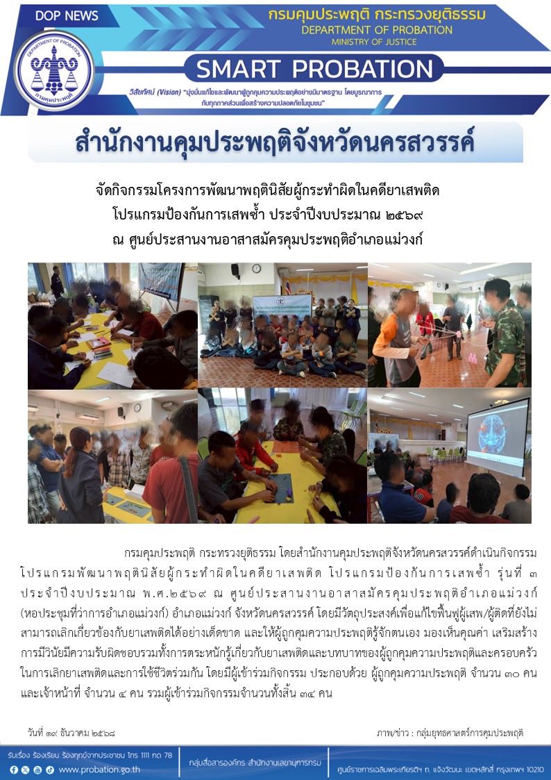 สำนักงานคุมประพฤติจังหวัดนครสวรรค์ ดำเนินกิจกรรมโปรแกรมพัฒนาพฤตินิสัยผู้กระทำผิดในคดียาเสพติด โปรแกรมป้องกันการเสพซ้ำ รุ่นที่ 3 ประจำปีงบประมาณ พ.ศ.2569