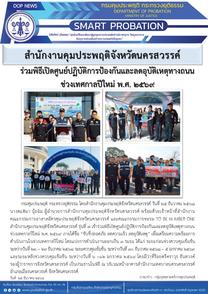 ผู้อำนวยการสำนักงานคุมประพฤติจังหวัดนครสวรรค์ พร้อมด้วยเจ้าหน้าที่สำนักงาน คณะกรรมการอาสาสมัครคุมประพฤติจังหวัดนครสวรรค์ และคณะกรรมการชมรม TO BE NUMBER ONE สำนักงานคุมประพฤติจังหวัดนครสวรรค์ รุ่นที่ 7 เข้าร่วมพิธีเปิดศูนย์ปฏิบัติการป้องกันและลดอุบัติเหตุทางถนนช่วงเทศกาลปีใหม่ พ.ศ. 2569 ภายใต้ชื่อ “ขับขี่ปลอดภัย ลดความเร็ว ลดอุบัติเหตุ” เพื่อเตรียมความพร้อมการดำเนินงานในช่วงเทศกาลปีใหม่