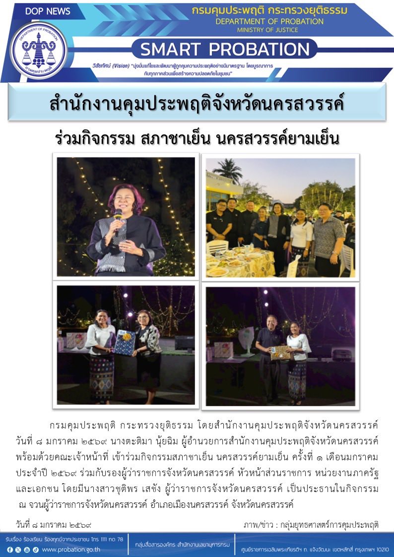 นางตะติมา นุ้ยฉิม ผู้อำนวยการสำนักงานคุมประพฤติจังหวัดนครสวรรค์ พร้อมด้วยคณะเจ้าหน้าที่ เข้าร่วมกิจกรรมสภาชาเย็น นครสวรรค์ยามเย็น ครั้งที่ 1 เดือนมกราคม ประจำปี 2569 ร่วมกับรองผู้ว่าราชการจังหวัดนครสวรรค์ หัวหน้าส่วนราชการ หน่วยงานภาครัฐ และเอกชน โดยมีนางสาวชุติพร เสชัง ผู้ว่าราชการจังหวัดนครสวรรค์ เป็นประธานในกิจกรรม ณ จวนผู้ว่าราชการจังหวัดนครสวรรค์ อำเภอเมืองนครสวรรค์ จังหวัดนครสวรรค์