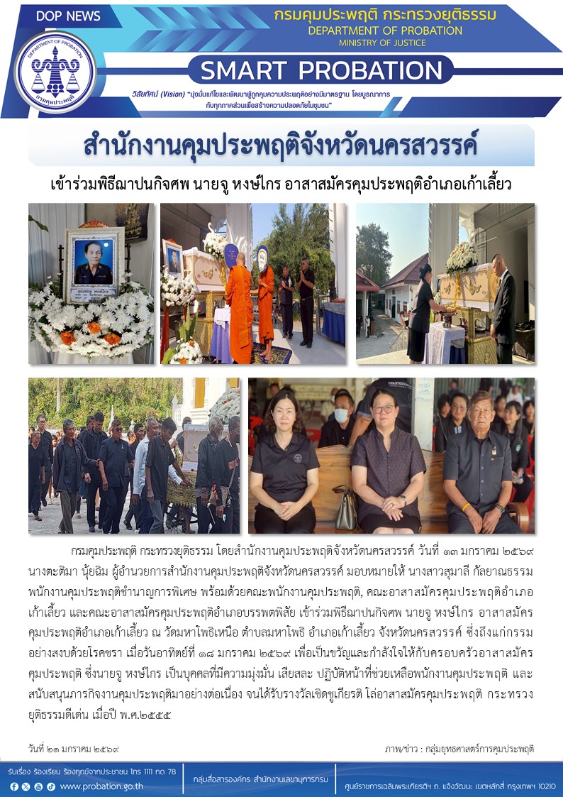 สำนักงานคุมประพฤติจังหวัดนครสวรรค์ เข้าร่วมพิธีฌาปนกิจศพ นายจู หงษ์ไกร อาสาสมัคร คุมประพฤติอำเภอเก้าเลี้ยว