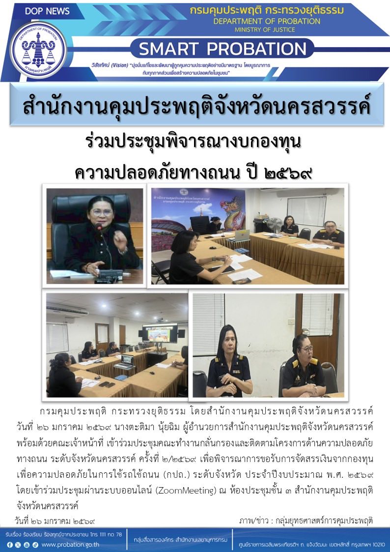 นางตะติมา นุ้ยฉิม ผู้อำนวยการสำนักงานคุมประพฤติจังหวัดนครสวรรค์ พร้อมด้วยคณะเจ้าหน้าที่ เข้าร่วมประชุมคณะทำงานกลั่นกรองและติดตามโครงการด้านความปลอดภัยทางถนน ระดับจังหวัดนครสวรรค์ ครั้งที่ 2/2569 เพื่อพิจารณาการขอรับการจัดสรรเงินจากกองทุนเพื่อความปลอดภัยในการใช้รถใช้ถนน (กปถ.) ระดับจังหวัด ประจำปีงบประมาณ พ.ศ. 2569 โดยเข้าร่วมประชุมผ่านระบบออนไลน์ (Zoom Meeting) ณ ห้องประชุมชั้น 3 สำนักงานคุมประพฤติจังหวัดนครสวรรค์