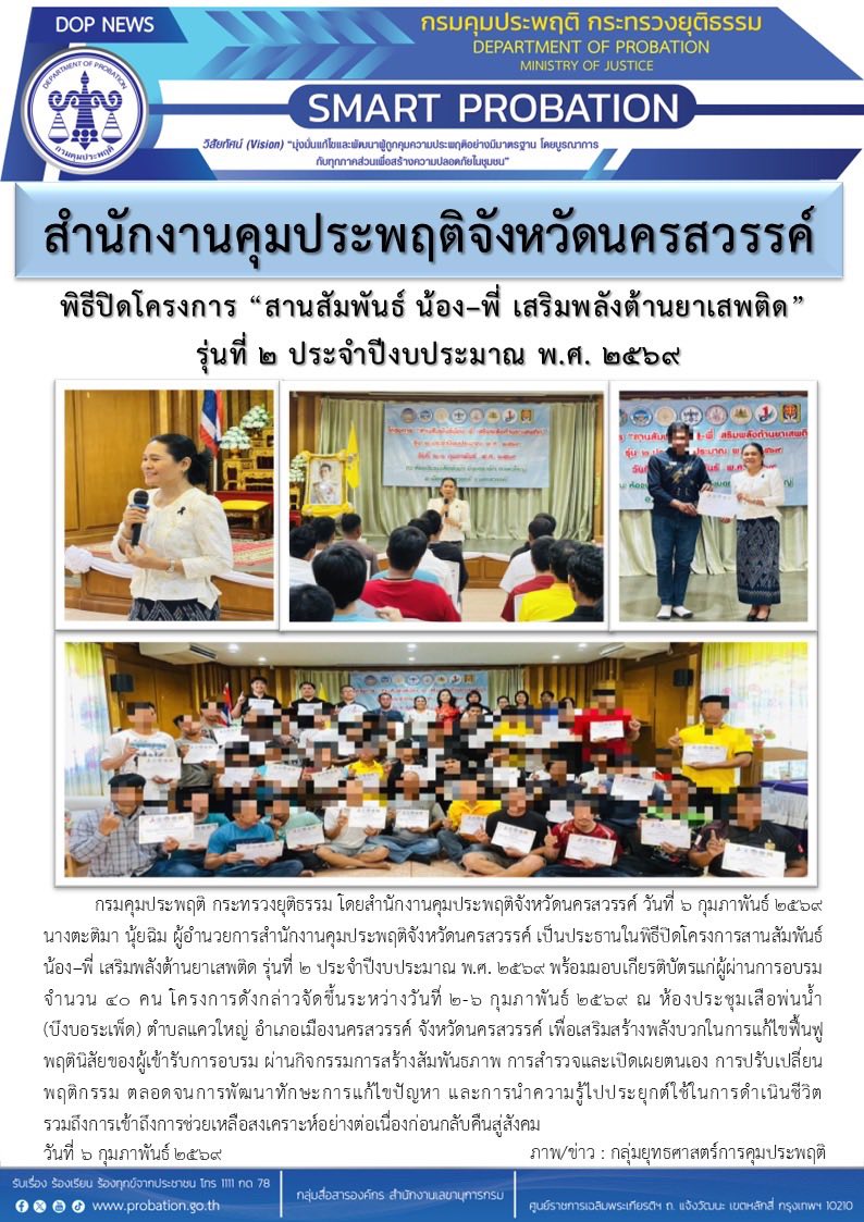 างตะติมา นุ้ยฉิม ผู้อำนวยการสำนักงานคุมประพฤติจังหวัดนครสวรรค์ เป็นประธานในพิธีปิดโครงการสานสัมพันธ์ น้อง–พี่ เสริมพลังต้านยาเสพติด รุ่นที่ 2 ประจำปีงบประมาณ พ.ศ. 2569 พร้อมมอบเกียรติบัตรแก่ผู้ผ่านการอบรม จำนวน 40 คน โครงการดังกล่าวจัดขึ้นระหว่างวันที่ 2-6 กุมภาพันธ์ 2569 ณ ห้องประชุมเสือพ่นน้ำ (บึงบอระเพ็ด) ตำบลแควใหญ่ อำเภอเมืองนครสวรรค์ จังหวัดนครสวรรค์