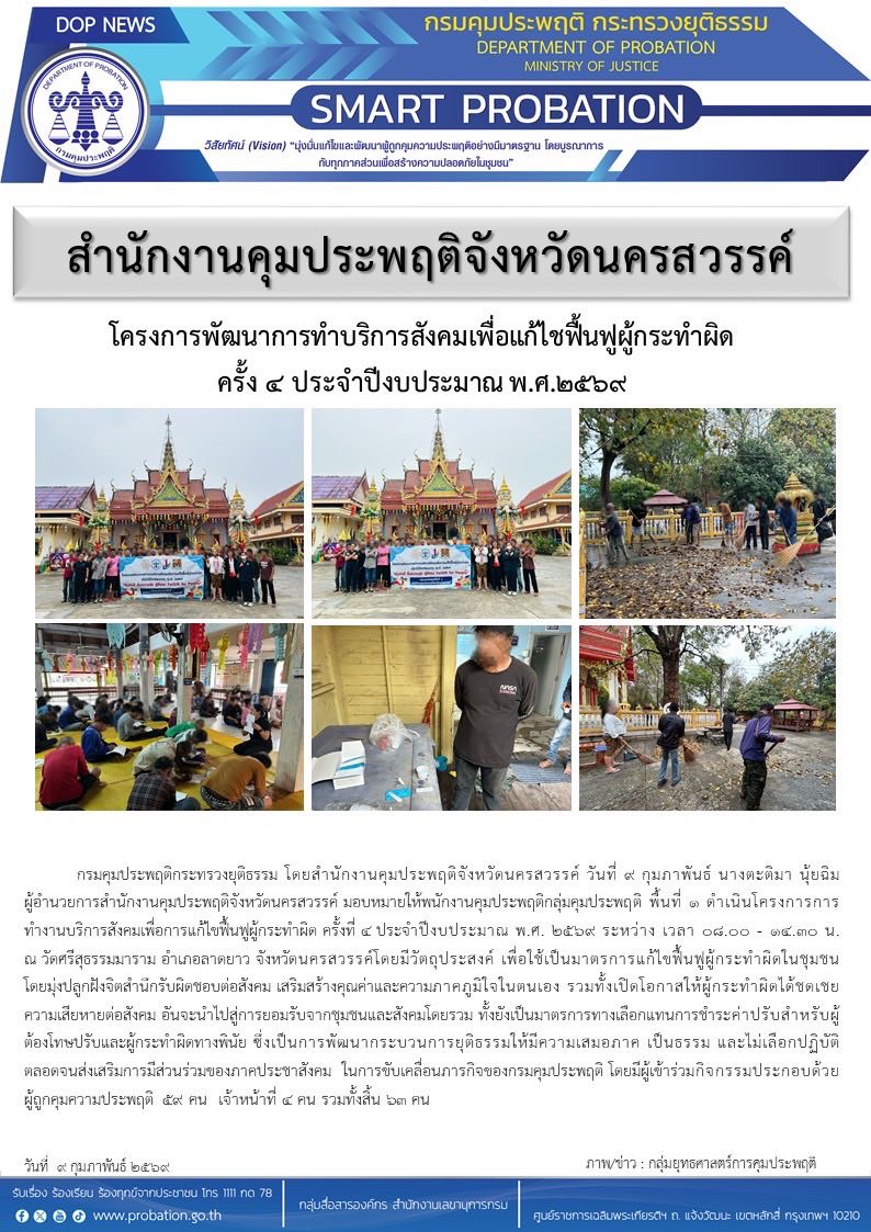พนักงานคุมประพฤติกลุ่มคุมประพฤติ พื้นที่ 1 ดำเนินโครงการการทำงานบริการสังคมเพื่อการแก้ไขฟื้นฟูผู้กระทำผิด ครั้งที่ 4 ประจำปีงบประมาณ พ.ศ. 2569 ณ วัดศรีสุธรรมมาราม อำเภอลาดยาว จังหวัดนครสวรรค์โดยมีวัตถุประสงค์ เพื่อใช้เป็นมาตรการแก้ไขฟื้นฟูผู้กระทำผิดในชุมชน โดยมุ่งปลูกฝังจิตสำนึกรับผิดชอบต่อสังคม