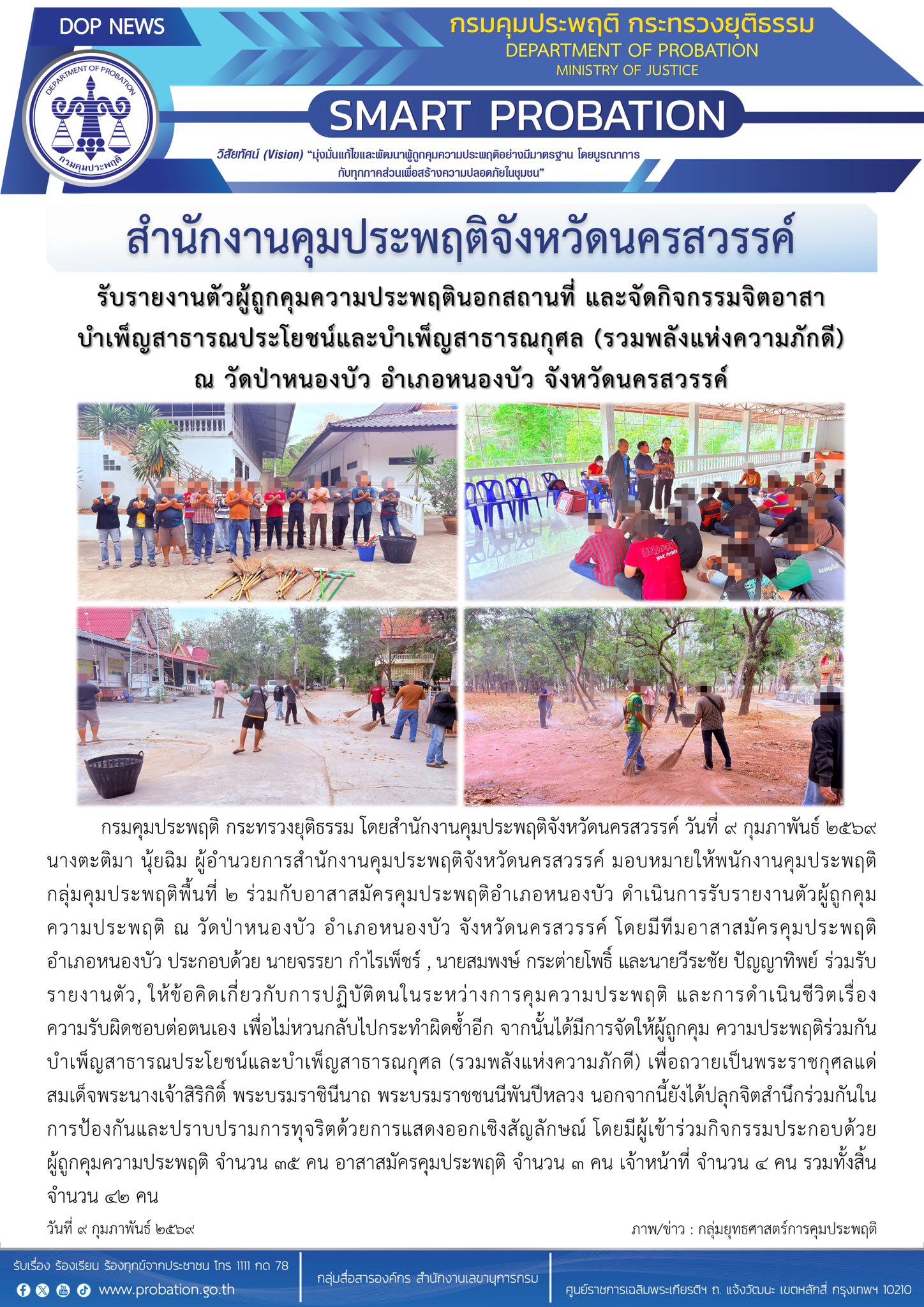 พนักงานคุมประพฤติกลุ่มคุมประพฤติพื้นที่ 2 ร่วมกับอาสาสมัครคุมประพฤติอำเภอหนองบัว ดำเนินการรับรายงานตัวผู้ถูกคุมความประพฤติ ณ วัดป่าหนองบัว อำเภอหนองบัว จังหวัดนครสวรรค์พนักงานคุมประพฤติกลุ่มคุมประพฤติพื้นที่ 2 ร่วมกับอาสาสมัครคุมประพฤติอำเภอหนองบัว ดำเนินการรับรายงานตัวผู้ถูกคุมความประพฤติ ณ วัดป่าหนองบัว อำเภอหนองบัว จังหวัดนครสวรรค์