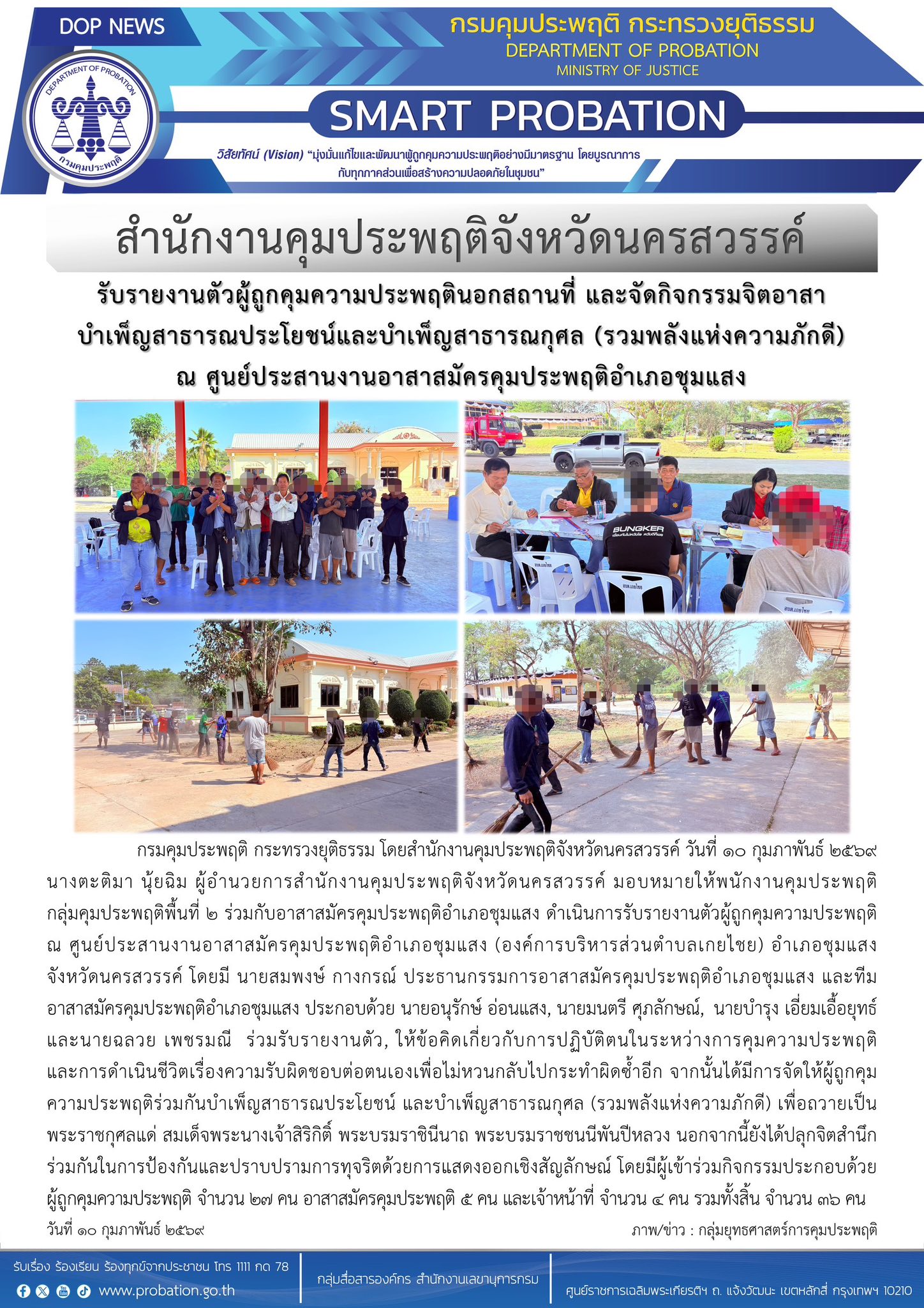 สำนักงานคุมประพฤติจังหวัดนครสวรรค์ ดำเนินการรับรายงานตัวผู้ถูกคุมความประพฤติ ณ ศูนย์ประสานงานอาสาสมัครคุมประพฤติอำเภอชุมแสง