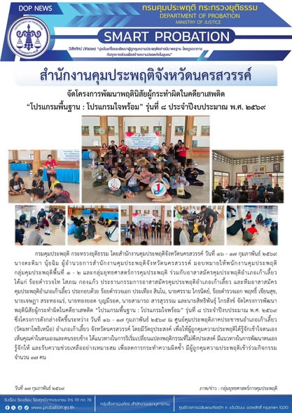 พนักงานคุมประพฤติกลุ่มคุมประพฤติพื้นที่ 1 - 2 และกลุ่มยุทธศาสตร์การคุมประพฤติ ร่วมกับอาสาสมัครคุมประพฤติอำเภอเก้าเลี้ยว จัดโครงการพัฒนาพฤตินิสัยผู้กระทำผิดในคดียาเสพติด “โปรแกรมพื้นฐาน : โปรแกรมใจพร้อม” รุ่นที่ 8 ประจำปีงบประมาณ พ.ศ. 2569 ซึ่งโครงการดังกล่างจัดขึ้นระหว่าง วันที่ 16 - 17 กุมภาพันธ์ 2569 ณ ศูนย์คุมประพฤติภาคประชาชนอำเภอเก้าเลี้ยว(วัดมหาโพธิเหนือ) อำเภอเก้าเลี้ยว จังหวัดนครสวรรค์