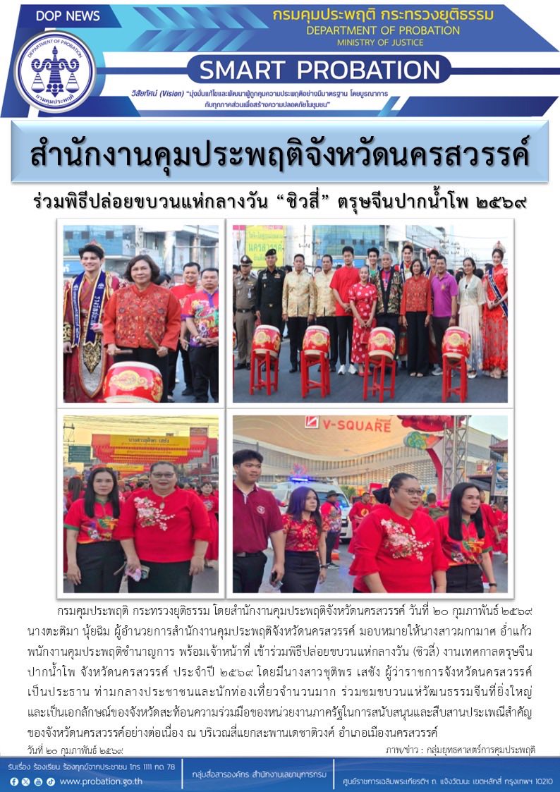 นางตะติมา นุ้ยฉิม ผู้อำนวยการสำนักงานคุมประพฤติจังหวัดนครสวรรค์ มอบหมายให้นางสาวผกามาศ อ่ำแก้ว พนักงานคุมประพฤติชำนาญการ พร้อมเจ้าหน้าที่ เข้าร่วมพิธีปล่อยขบวนแห่กลางวัน (ชิวสี่) งานเทศกาลตรุษจีนปากน้ำโพ จังหวัดนครสวรรค์ ประจำปี 2569 โดยมีนางสาวชุติพร เสชัง ผู้ว่าราชการจังหวัดนครสวรรค์ เป็นประธาน ท่ามกลางประชาชนและนักท่องเที่ยวจำนวนมาก ร่วมชมขบวนแห่วัฒนธรรมจีนที่ยิ่งใหญ่และเป็นเอกลักษณ์ของจังหวัด