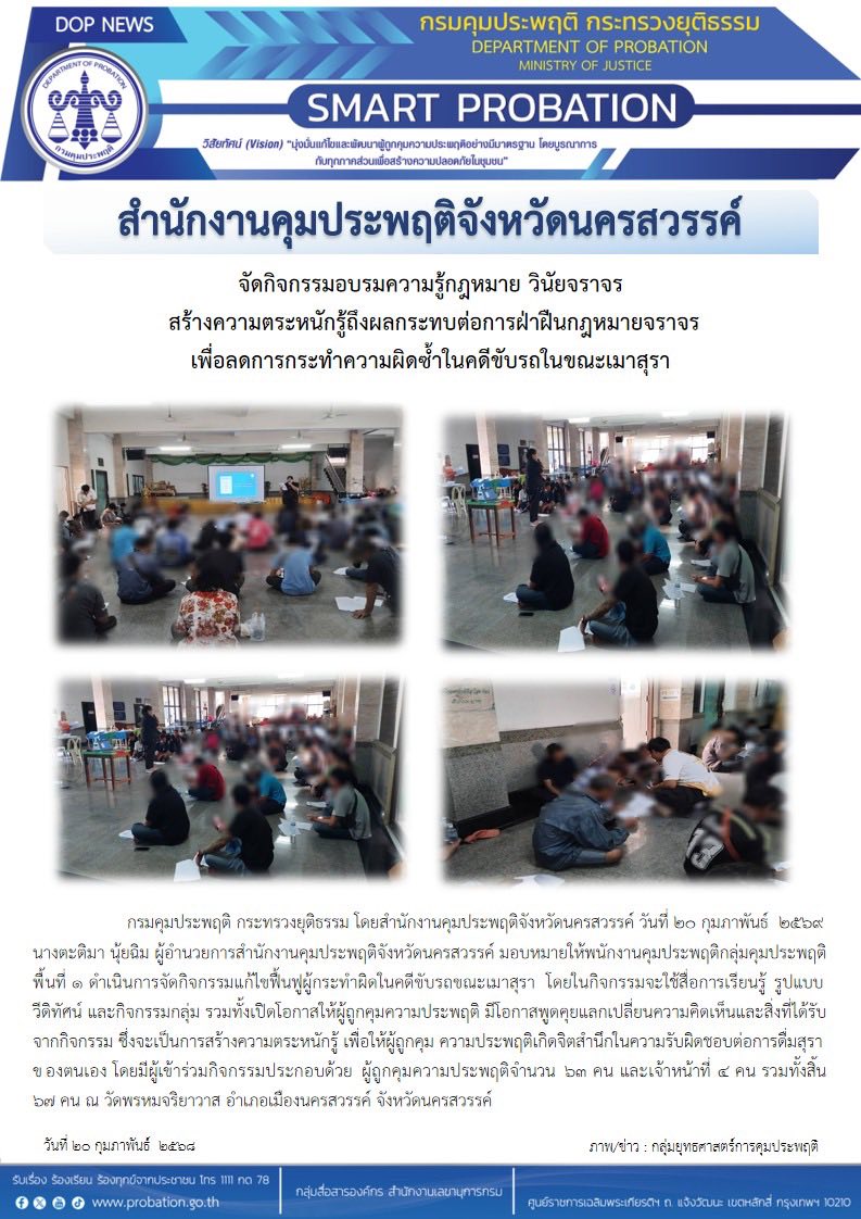 สำนักงานคุมประพฤติจังหวัดนครสวรรค์ ดำเนินการจัดกิจกรรมแก้ไขฟื้นฟูผู้กระทำผิดในคดีขับรถขณะเมาสุรา