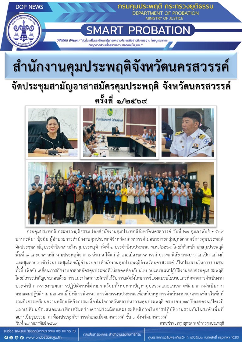 ผู้อำนวยการสำนักงานคุมประพฤติจังหวัดนครสวรรค์ มอบหมายกลุ่มยุทธศาสตร์การคุมประพฤติ จัดประชุมสามัญประจำปีอาสาสมัครคุมประพฤติ ครั้งที่ 1 ประจำปีงบประมาณ พ.ศ. 2569 โดยมีหัวหน้ากลุ่มคุมประพฤติพื้นที่ 1 และอาสาสมัครคุมประพฤติจาก 6 อำเภอ ได้แก่ อำเภอเมืองนครสวรรค์ บรรพตพิสัย ลาดยาว แม่เปิน แม่วงก์ และชุมตาบง เข้าร่วมประชุมโดยมีผู้อำนวยการสำนักงานคุมประพฤติจังหวัดนครสวรรค์ เป็นประธานในการประชุม ทั้งนี้ เพื่อขับเคลื่อนภารกิจงานอาสาสมัครคุมประพฤติให้สอดคล้องกับนโยบายและแผนปฏิบัติงานของกรมคุมประพฤติ