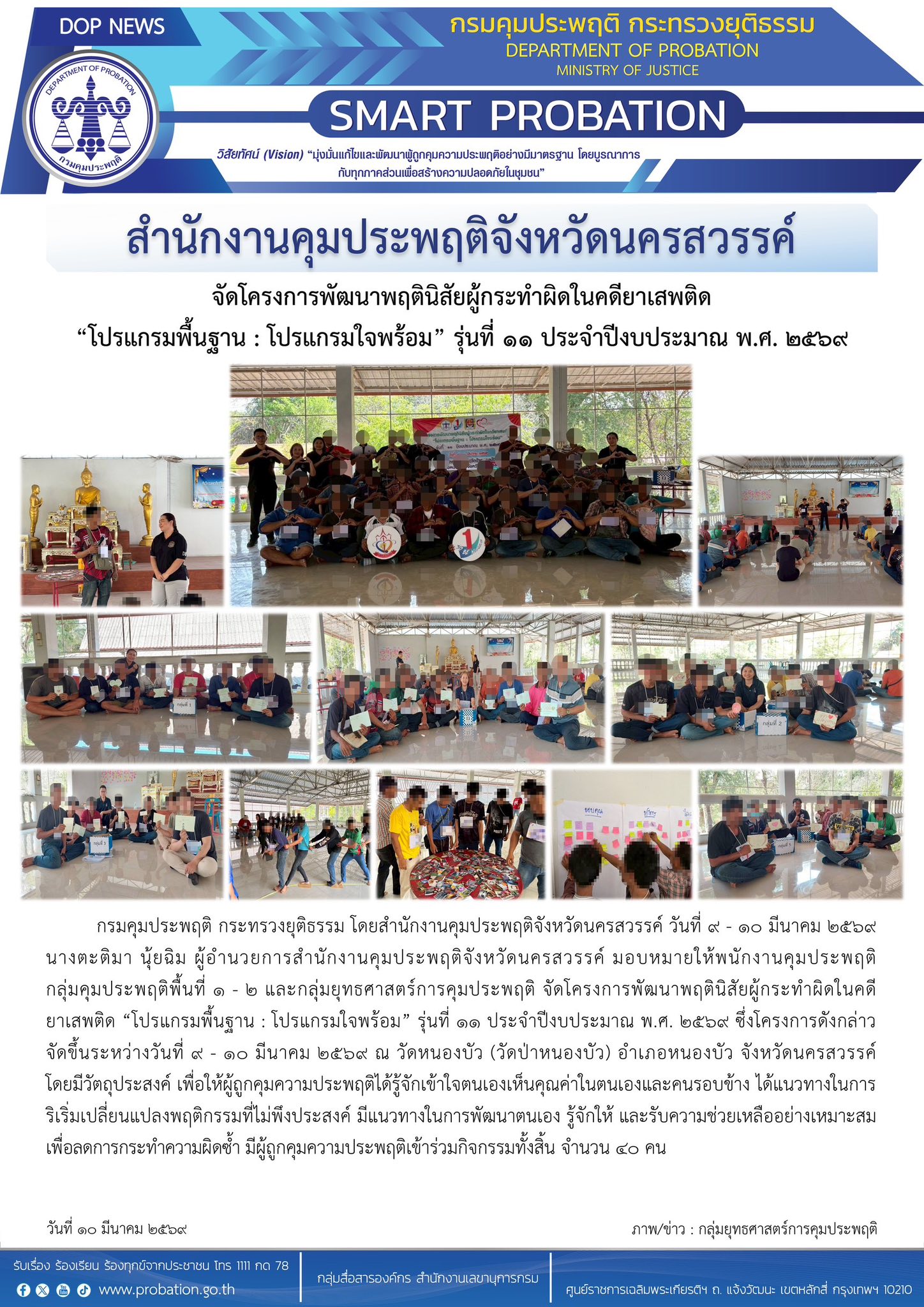พนักงานคุมประพฤติกลุ่มคุมประพฤติพื้นที่ 1 - 2 และกลุ่มยุทธศาสตร์การคุมประพฤติ จัดโครงการพัฒนาพฤตินิสัยผู้กระทำผิดในคดียาเสพติด “โปรแกรมพื้นฐาน : โปรแกรมใจพร้อม” รุ่นที่ 11 ประจำปีงบประมาณ พ.ศ. 2569 ซึ่งโครงการดังกล่าวจัดขึ้นระหว่างวันที่ 9 - 10 มีนาคม 2569 ณ วัดหนองบัว (วัดป่าหนองบัว) อำเภอหนองบัว จังหวัดนครสวรรค์ โดยมีวัตถุประสงค์ เพื่อให้ผู้ถูกคุมความประพฤติได้รู้จักเข้าใจตนเองเห็นคุณค่าในตนเองและคนรอบข้าง ได้แนวทางในการริเริ่มเปลี่ยนแปลงพฤติกรรมที่ไม่พึงประสงค์ มีแนวทางในการพัฒนาตนเองฯ