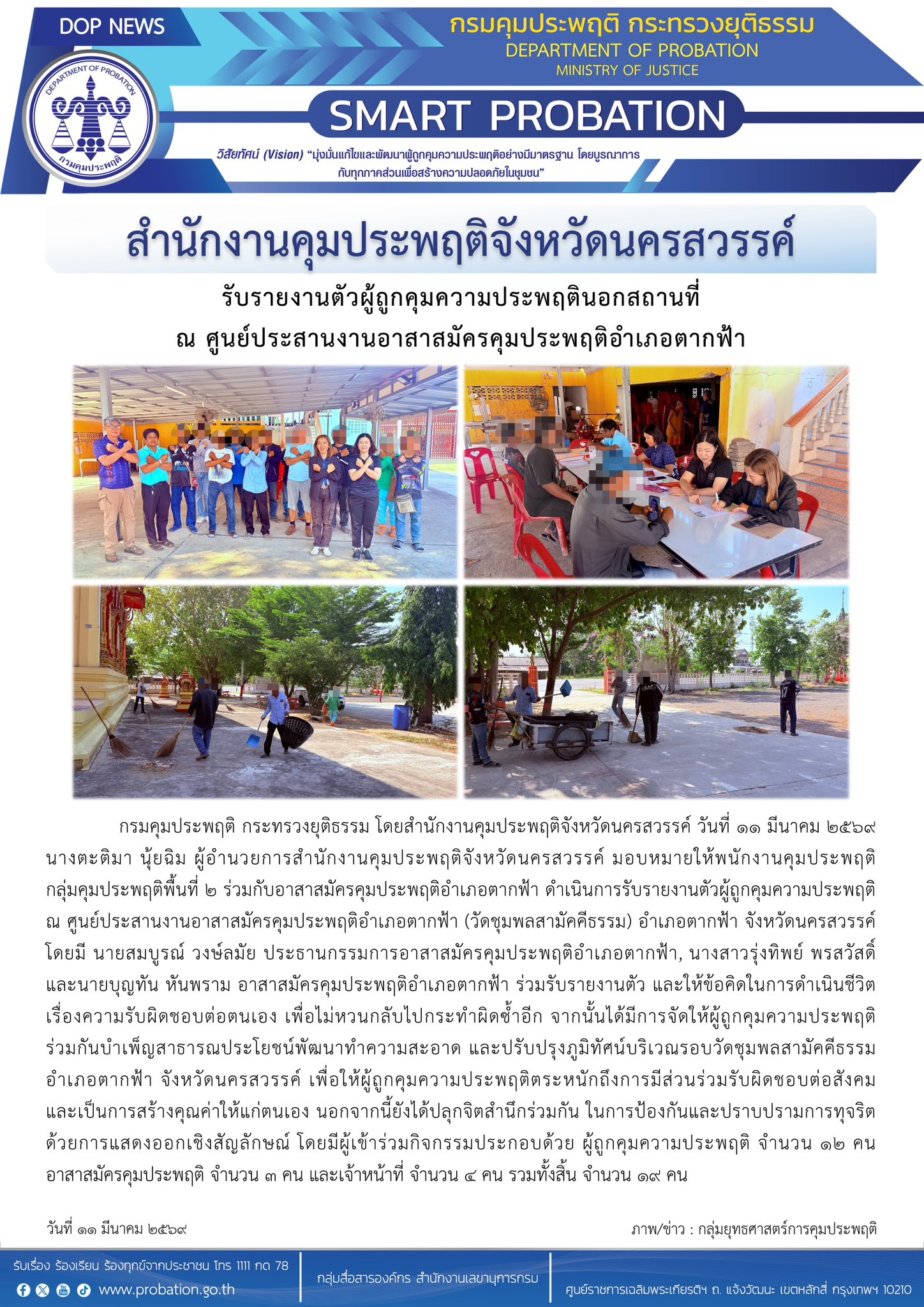 พนักงานคุมประพฤติกลุ่มคุมประพฤติพื้นที่ 2 ร่วมกับอาสาสมัครคุมประพฤติอำเภอตากฟ้า ดำเนินการรับรายงานตัวผู้ถูกคุมความประพฤติ ณ ศูนย์ประสานงานอาสาสมัครคุมประพฤติอำเภอตากฟ้า (วัดชุมพลสามัคคีธรรม) ให้ข้อคิดในการดำเนินชีวิต เรื่องความรับผิดชอบต่อตนเอง เพื่อไม่หวนกลับไปกระทำผิดซ้ำอีก จากนั้นได้มีการจัดให้ผู้ถูกคุมความประพฤติร่วมกันบำเพ็ญสาธารณประโยชน์พัฒนาทำความสะอาด และปรับปรุงภูมิทัศน์บริเวณรอบวัดชุมพลสามัคคีธรรม