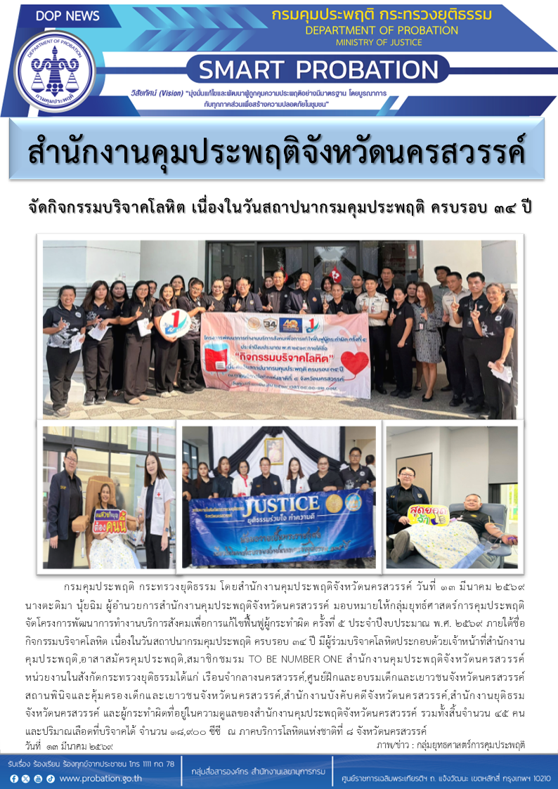 สำนักงานคุมประพฤติจังหวัดนครสวรรค์ จัดกิจกรรมบริจาคโลหิต เนื่องในวันสถาปนากรมคุมประพฤติ ครบรอบ 34 ปี
