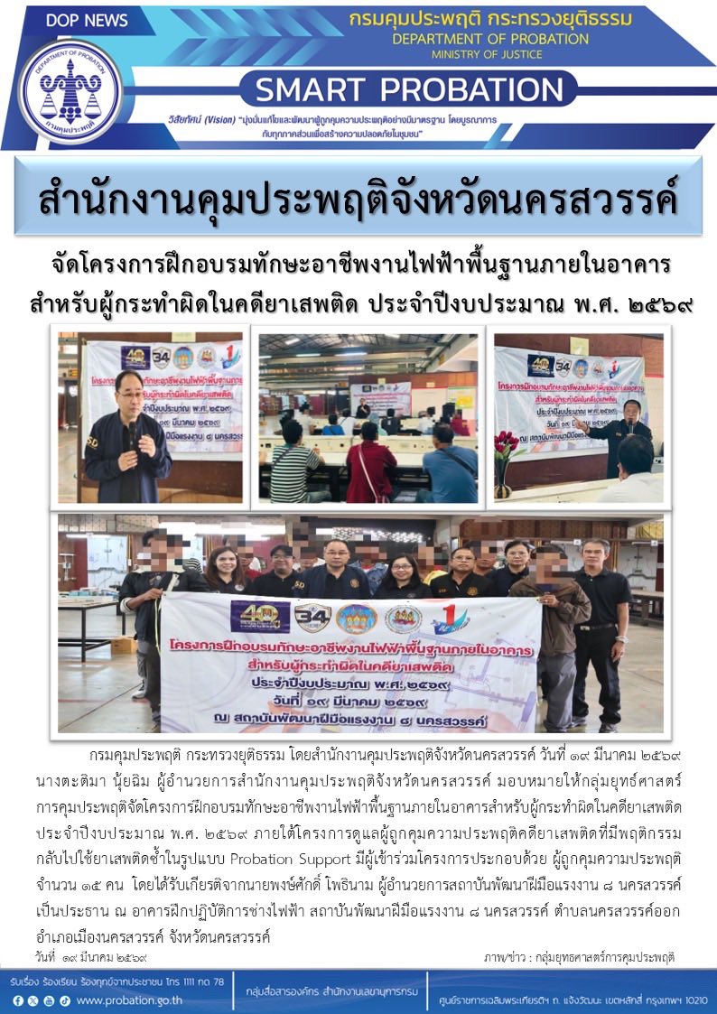 กลุ่มยุทธ์ศาสตร์การคุมประพฤติจัดโครงการฝึกอบรมทักษะอาชีพงานไฟฟ้าพื้นฐานภายในอาคารสำหรับผู้กระทำผิดในคดียาเสพติด ประจำปีงบประมาณ พ.ศ. 2569 ภายใต้โครงการดูแลผู้ถูกคุมความประพฤติคดียาเสพติดที่มีพฤติกรรมกลับไปใช้ยาเสพติดซ้ำในรูปแบบ Probation Support